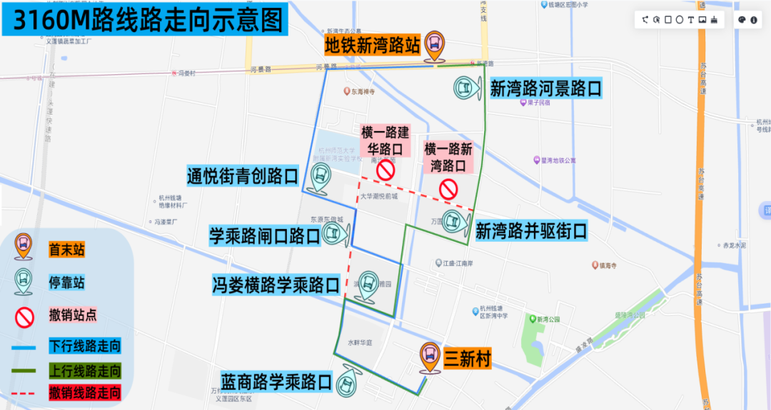 2.3161M路,冯娄横路建华路口至新湾路河景路口调整为新湾公交站至新湾路河景路口。